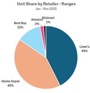 From January to November 2025, GE increased its lead in the range market after growing unit share by 1.6ppts and dollar share by 2.3ppts compared to 2024. Samsung ranked second in the range market with about 16% unit share at major retailers. While LG trended up in 2025 (+1.4ppts compared to 2024), Whirlpool’s unit share declined by 1.9ppts. Lowe’s captured the highest unit share among major retailers in 2025 (43%) following Home Depot’s retail market leadership in 2024.