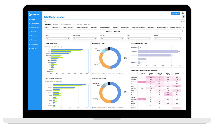 Built specifically for durables categories, OpenBrand combines unmatched market share modeling, real-time pricing and promotion tracking, inventory visibility, and the industry’s only consumer tracking survey into one solution.