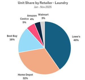 From January to November 2025, LG maintained leadership in the laundry market with about 24% unit share and 28% dollar share across major retailers. While LG’s share remained consistent with its 2024 share, Samsung experienced about a 2ppt year-over-year unit share increase while Whirlpool lost about 1ppt of unit share. Similar to 2024, Lowe’s captured 40% of the laundry unit share in 2025 while Home Depot followed with 32% unit share.