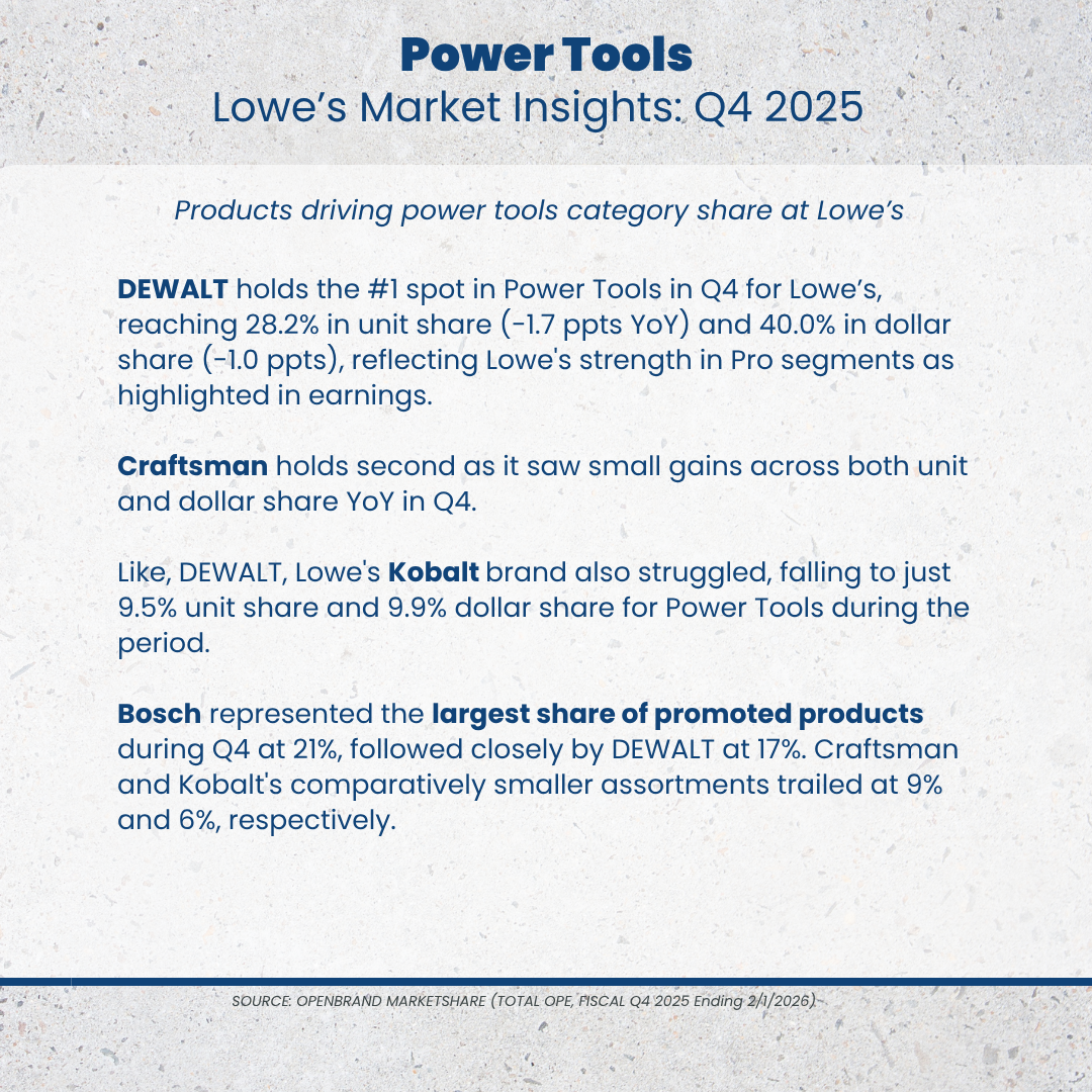 - DEWALT maintained its lead in power tools at Lowe’s in Q4, reaching 28.2% in unit share despite YoY decline (-1.7 ppts) and 40.0% in dollar share (-1.0 ppts), reflecting Lowe’s growing strength in Pro segments as highlighted in earnings.