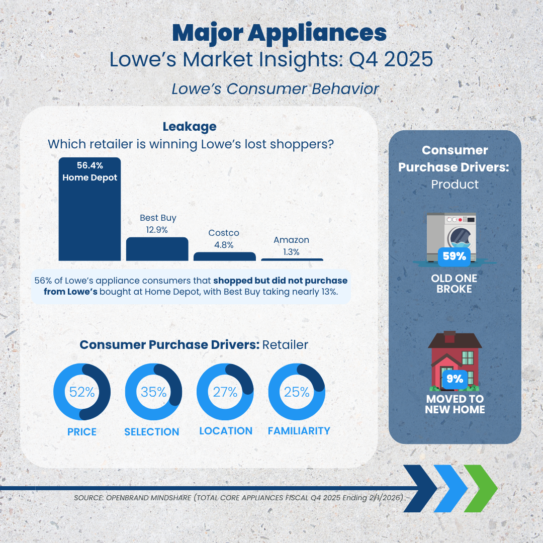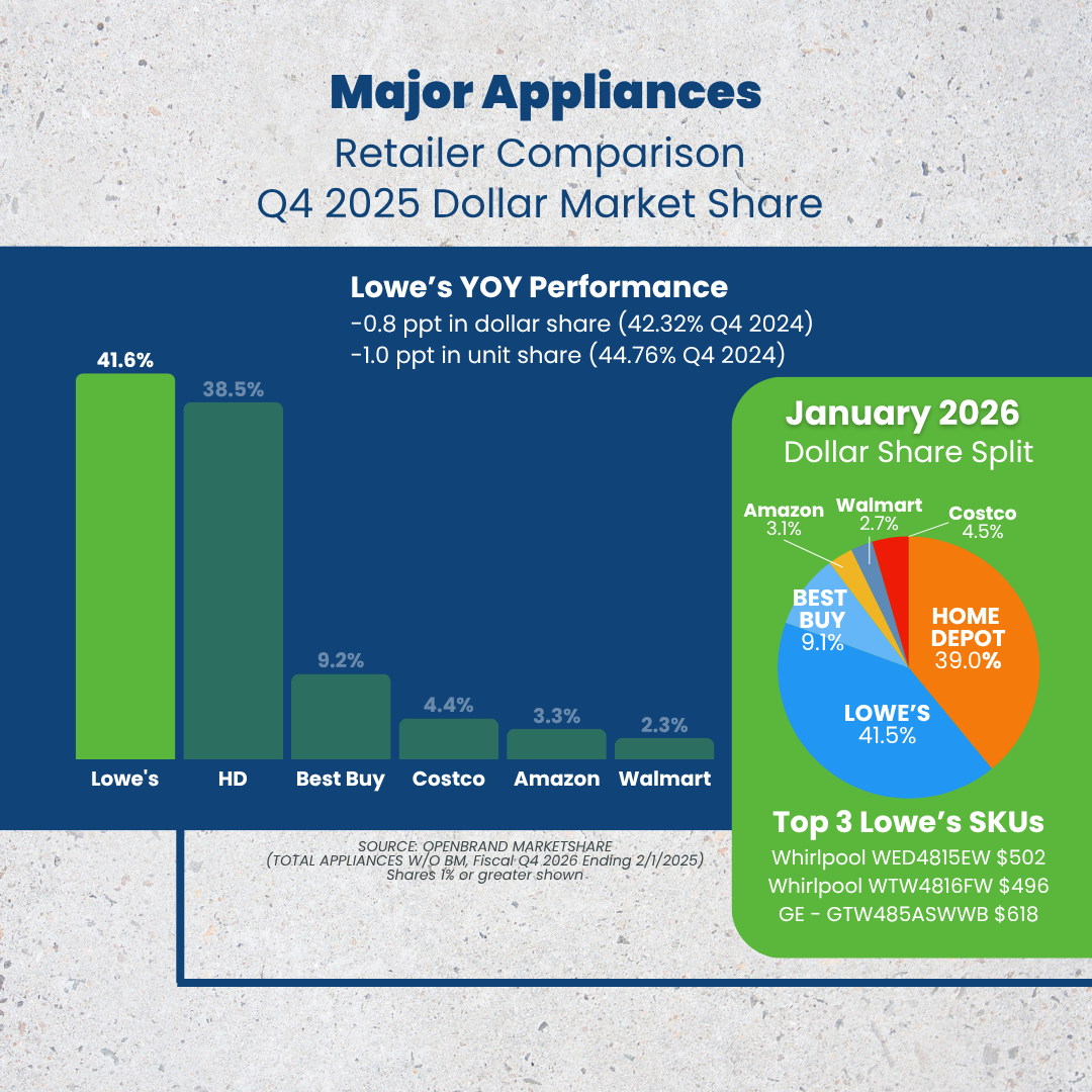 In Q4 2025, Lowe’s lost some traction in the major appliances category, decreasing dollar share slightly (-0.8 ppt) year-over-year (YOY), and unit share by -1.0 ppt. They remain market leader but Home Depot is gaining ground as they picked up +1.3 ppt of dollar share working to close the 3 ppt gap between these two appliance leaders. Leakage data also indicated 56% of Lowe’s appliances shoppers that shopped but did not purchase from Lowe’s bought at Home Depot.