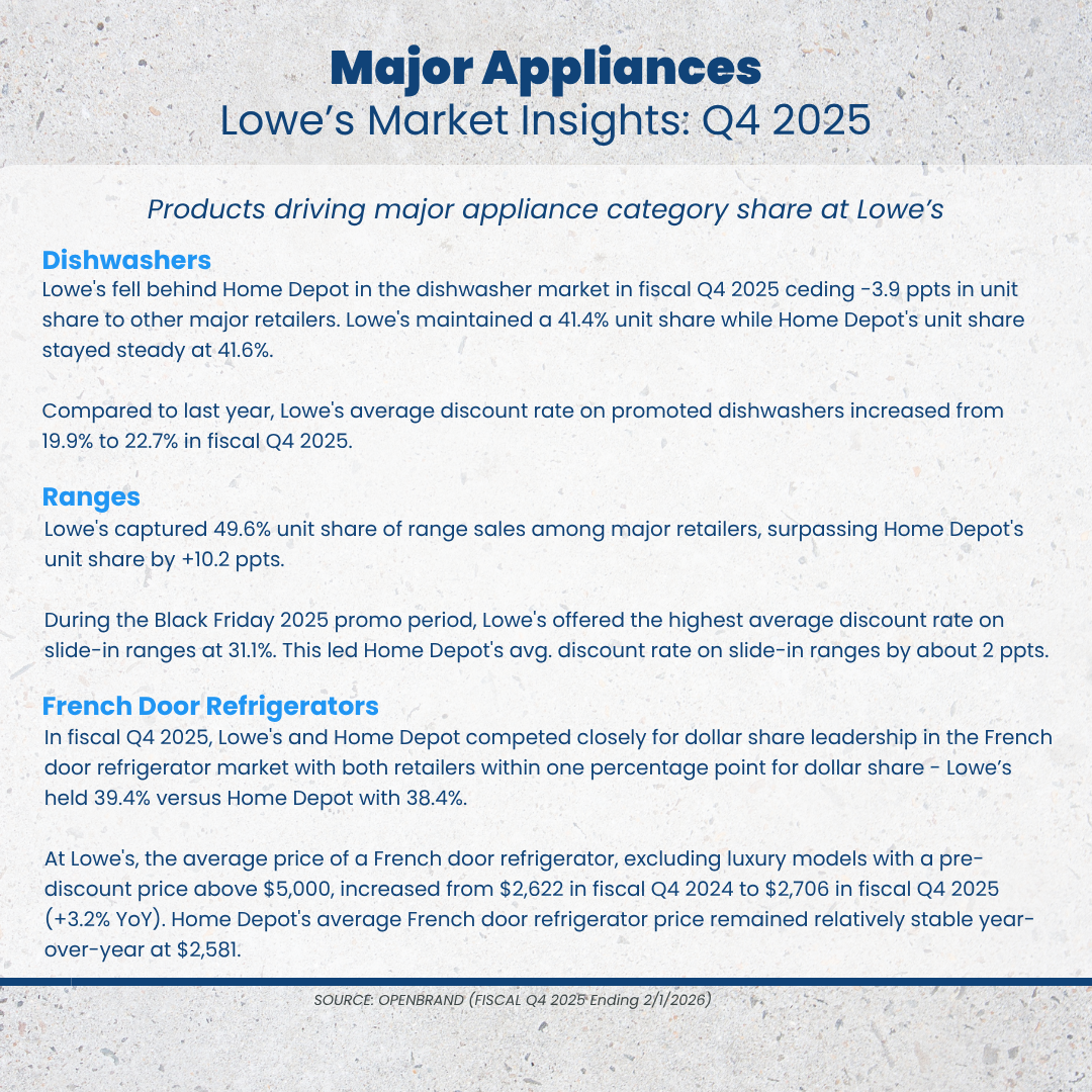 - Dishwashers: Lowe’s falls behind Home Depot in the dishwasher category for fiscal Q4 2025 losing nearly 4 ppts (-3.9 ppts) to other major retailers. Lowe’s held a 41.4% unit share while Home Depot was slightly ahead with 41.6%. Compared to last year, Lowe’s average discount rate on promoted dishwashers increased by 2.8 ppt with an average of 22.7%.