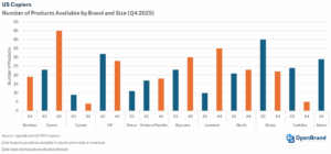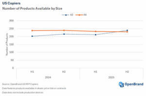 This shift was driven by portfolio updates, with some vendors continuing to offer new products alongside predecessors. In addition, OpenBrand recently gained access to Katun pricing, driving the overall number of A3 products higher. Looking ahead, however, product counts are expected to normalize once predecessors are phased out of the channel, bringing a return to brands offering more A4s than A3s to their channel partners.