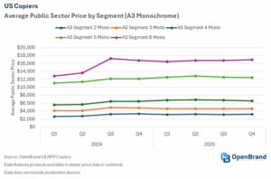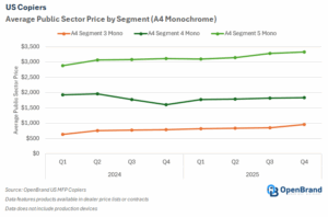Between Q1 2024 and Q4 2025, average A3 color segment public sector prices increased across all tiers, primarily reflecting tariff-related price increases. Segment 1 Color rose by 21%, increasing from $3,698 to $4,474, while Segment 2 Color climbed 31% to $5,581. Segment 3 Color grew by 32%, rising from $5,710 to $7,540. Segment 4a Color experienced the strongest growth at 36%, increasing from $6,527 to $8,899. Segment 4b Color increased by 17%, from $9,338 to $10,955, and Segment 5 Color saw a 14% rise from $12,581 to $14,361.