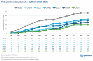 Copier hardware launch activity was steady for most of the year but demonstrated notable upticks toward the latter part of the year with major launches from Canon in September and Sharp in October. With a total of 97 products introduced for the US dealer channel, this year’s launch activity had 20% fewer product launches than last year, tying with 2021 as the slowest year in terms of launch activity.