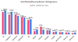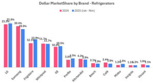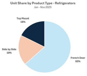 From January to November 2025, LG maintained leadership in the refrigerator market with about 19% unit share and 22% dollar share across major retailers. Frigidaire ranked second in unit share while Samsung ranked second in dollar share, reflecting Frigidaire’s value positioning and Samsung’s premium positioning. Lowe’s and Home Depot competed closely in the refrigerator market, with Lowe’s holding a slight lead over Home Depot in refrigerator unit share in 2025 (36% vs. 34%). French Door refrigerators remained the preferred configuration, composing 63% of unit sales.