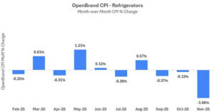 Refrigerator prices fluctuated throughout 2025 as manufacturers balanced tariff challenges with discounting strategy during key promotional periods. According to OpenBrand’s Consumer Price Index, refrigerator prices climbed month-over-month in March (+0.81% MoM), May (+1.21% MoM), and August (+0.57% MoM). Refrigerator prices experienced three consecutive months of price deflation starting in September and peaking in November (-1.66% MoM) as Black Friday promotions took effect. This pattern signals a trend towards price stability entering 2026.