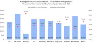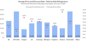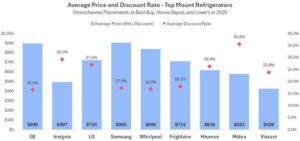 Despite tariff fears, market leaders like LG, Samsung, Whirlpool, Frigidaire, and GE maintained significant discounts in 2025. These market leaders offered average discount rates above 28% for a French Door refrigerator. LG and Samsung extended these heavy promotions to their Side-by-Side portfolios, with both brands offering average discount rates above 26% on promoted models. Premium brands like GE Profile and KitchenAid promoted savings above 20% despite an average price nearing $3,000. At Lowe’s, Hisense refrigerators received heavy promotional discounts during Independence Day and Black Friday with advertised savings above 40%.