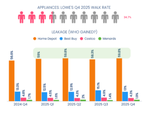 According to OpenBrand’s consumer insights data, Lowe’s converts major appliance shoppers at a significantly higher rate than Home Depot (66% vs. 59%). Leakage reveals the real opportunity: