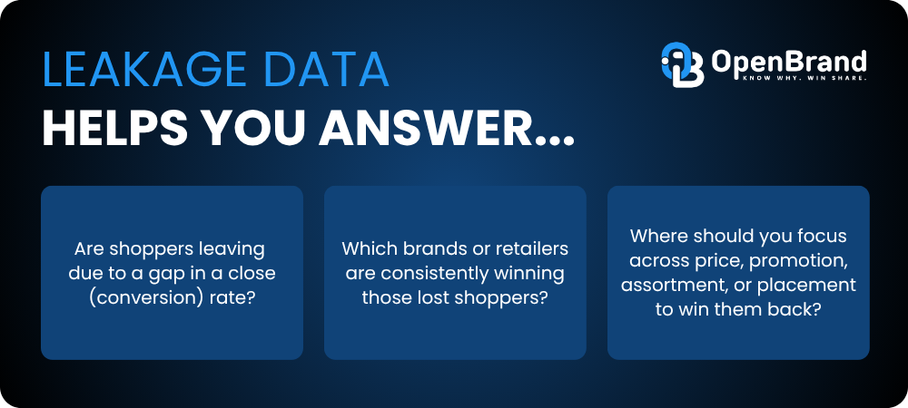 Unlike traditional performance metrics, leakage goes beyond lost sales to reveal who wins lost shoppers and provides a target for where to focus next.