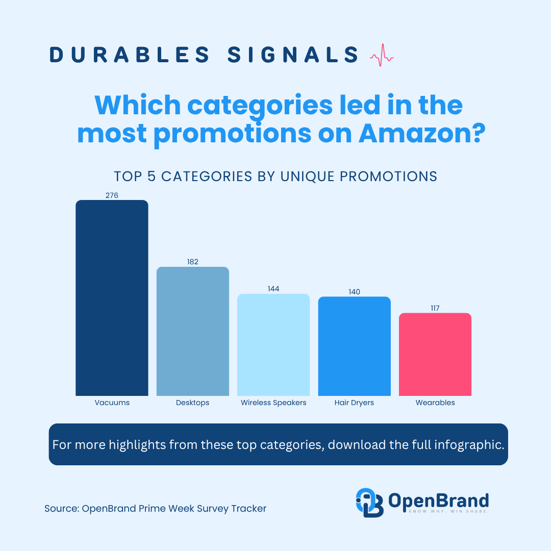 Our team at OpenBrand analyzed shopper behavior, promotional trends, and pricing effectiveness across durables categories to surface the highlights of Prime Day 2025 – and highlight where durables brands and retailers should focus heading into the next wave of key promotional events.