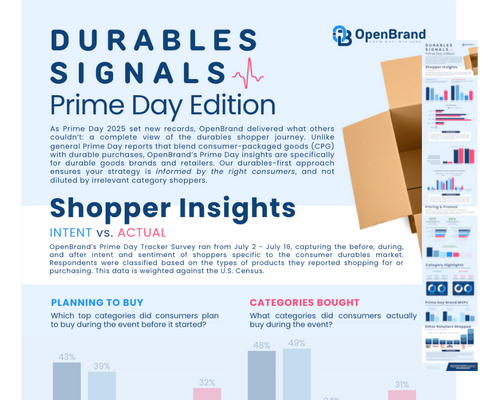 OpenBrand ran a targeted Prime Day Tracker Survey from July 2 – July 16, capturing the before, during, and after intent and sentiment of shoppers specific to the consumer durables market. Respondents were classified based on the types of products they reported shopping for or purchasing, and all data is weighted against the U.S. Census.